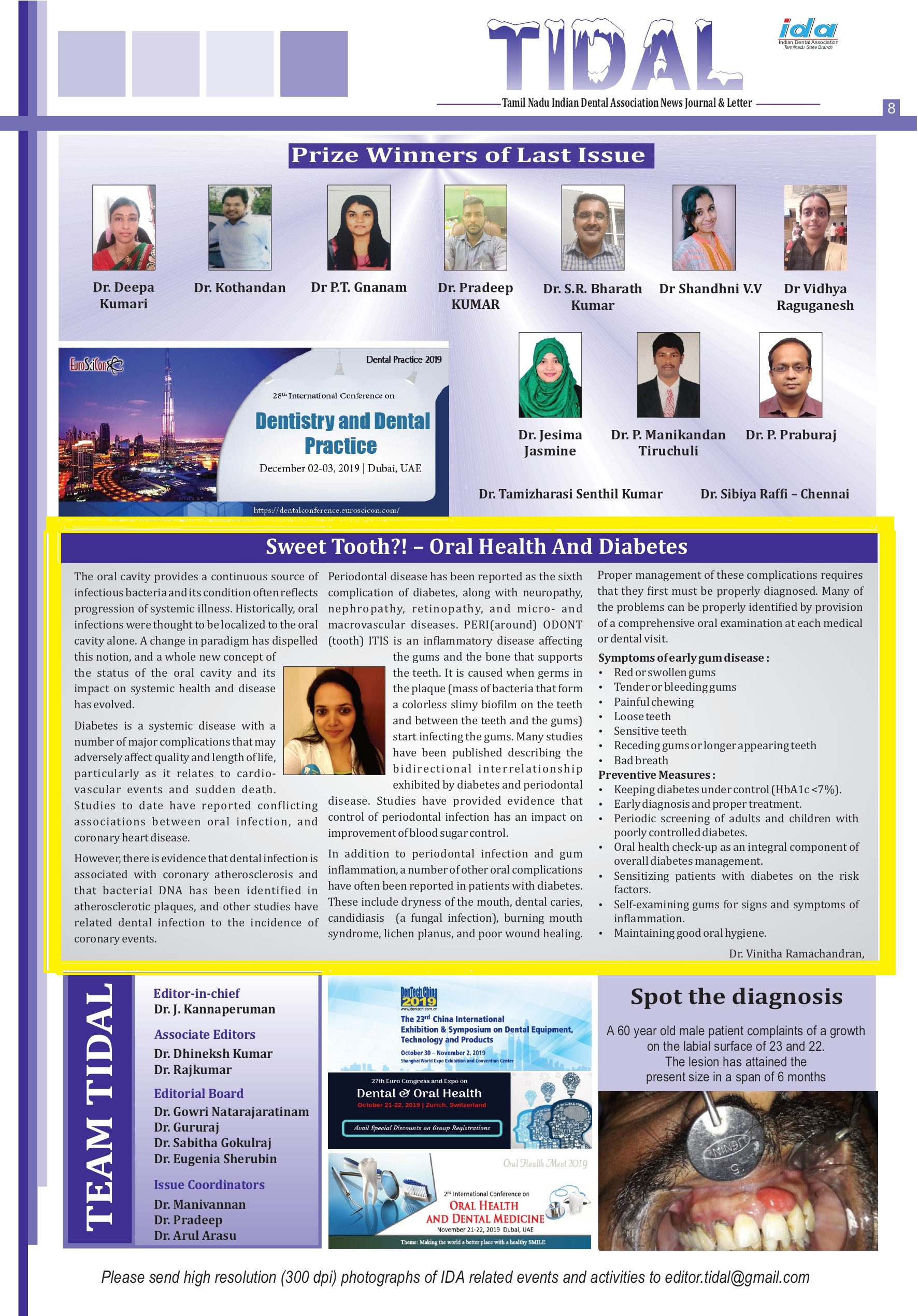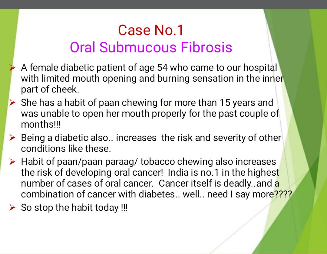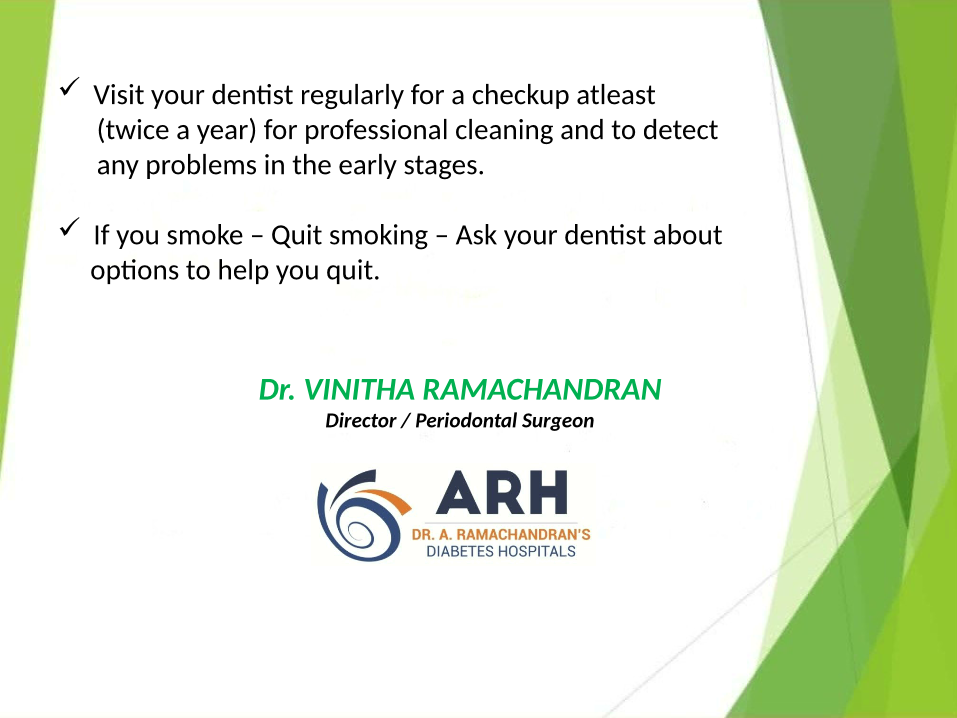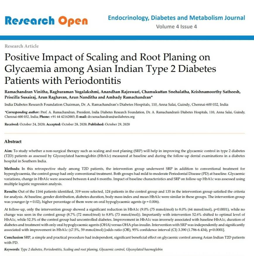 Chronic periodontitis, considered as the 6th complication of diabetes is detected early by dental check up. Other oral manifestations of diabetes can also be detected early and treated with utmost care.